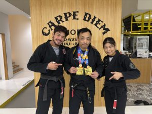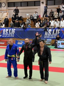 対戦相手は夏の同じ会場での試合で、クローズドガードに閉じ込められて何にも出来なかったホドリゴ・ソウザ先生。延長サドンデスの展開、これまた自分の柔術試合史上初めて引き込んでハーフガードからのフックスイープで勝ちました。