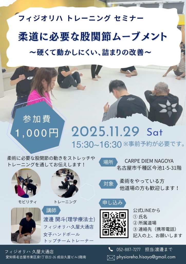 特別クラス / 名古屋 / ホープ 2025.11.14フィジオリハトレーニングセミナー柔術に必要な股関節ムーブメント〜硬くて動かしにくい、詰まりの改善〜📍開催日:11月29日(土) 1...